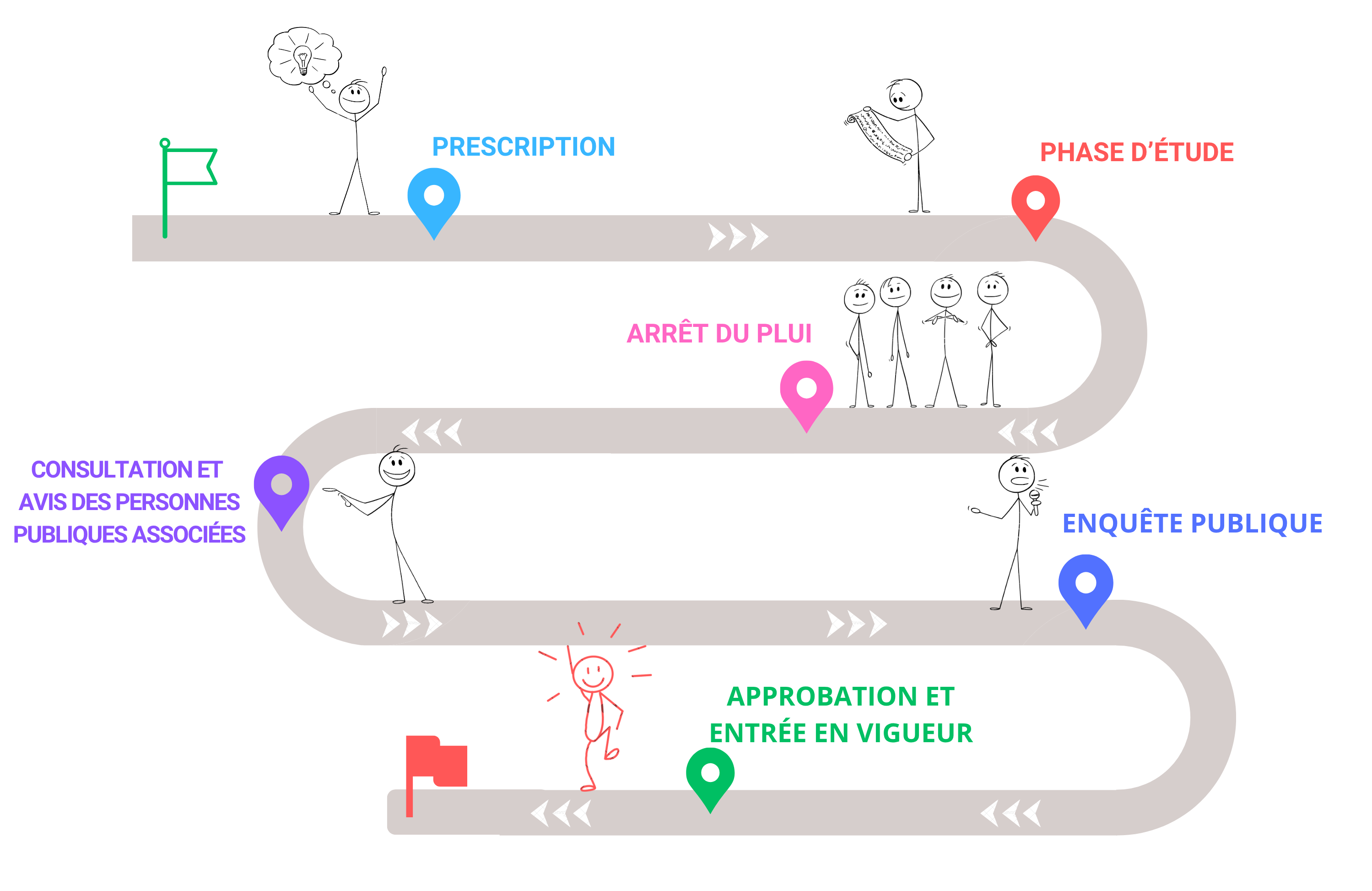 L’élaboration d’un PLUi dure en moyenne 5 à 6 ans. Elle est rythmée par de nombreuses étapes, réglementées par le Code de l’Urbanisme.